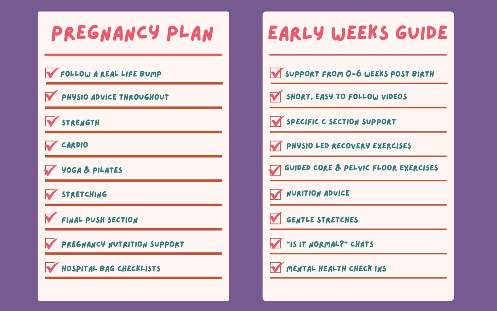 Thank you so much for your program. I joined you at 12 weeks pregnant and have followed along week by week. I had a 6 week break to have my baby and now have just completed the post natal plan. I feel strong and ready to return to my regular exercise and so much quicker this pregnancy than my previous one - this is all down to you, I've loved it, thanks again. x